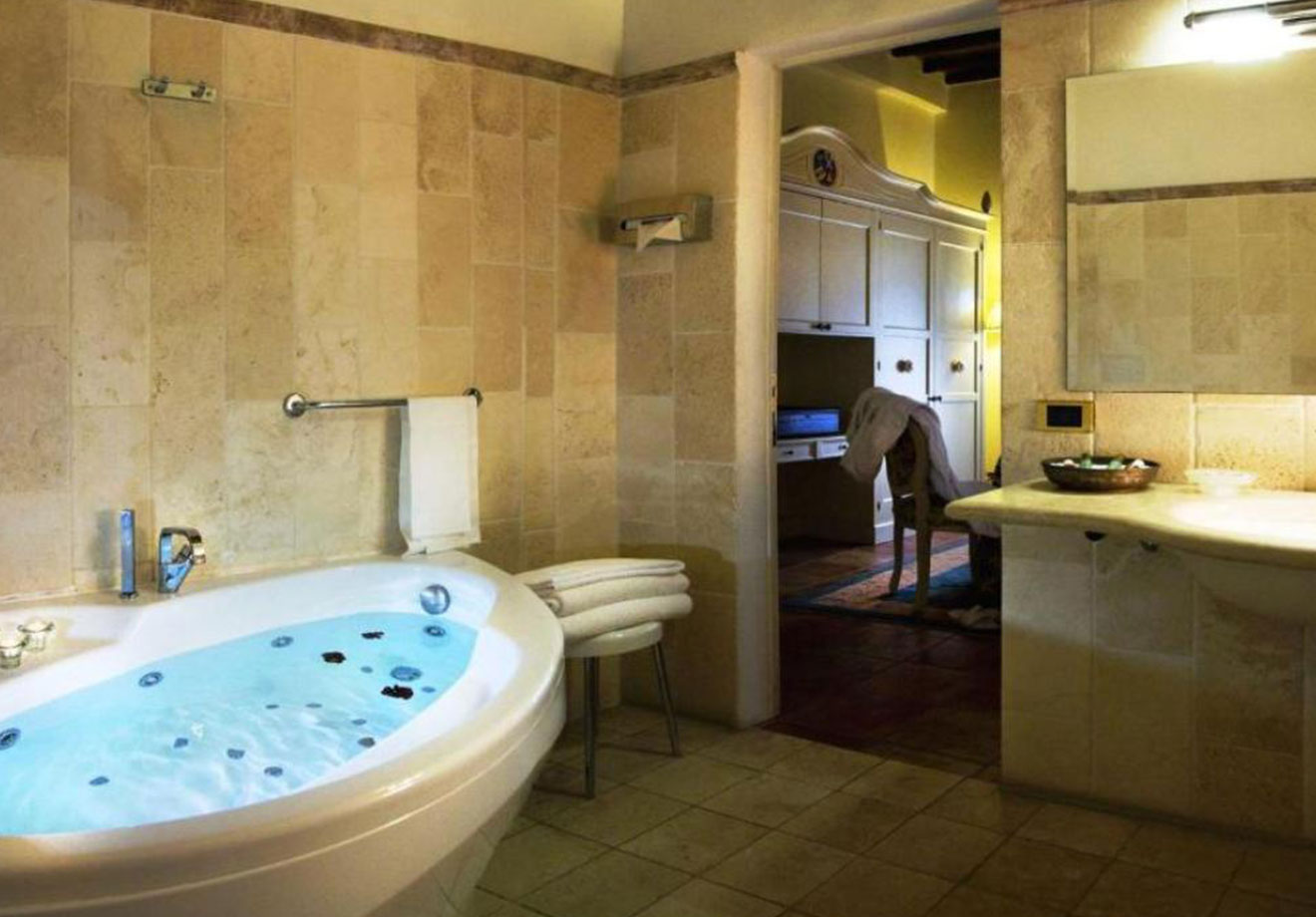 Palio: a bright suite with an enchanting view of the Crete Senesi and a beautiful hot tub, the true highlight of the room.